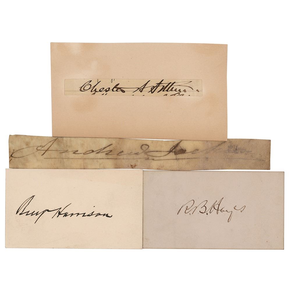 Group lot of four ink signatures of American Presidents Andrew Jackson, Rutherford B. Hayes, Benjamin Harrison, and Chester A. Arthur on individual off-white slips or cards ranging in size from 3.5 x .5 to 6.75 x .75; the Arthur is affixed to a slightly larger backing sheet. In overall fine condition.