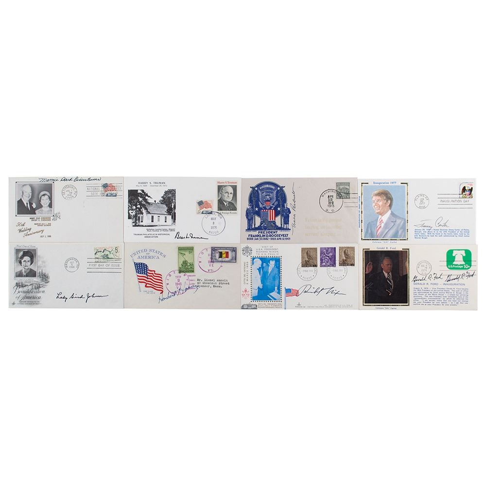 Group of eight FDCs and commemorative covers signed by presidents and first ladies, including: Herbert Hoover, Richard Nixon, Gerald Ford (signed twice), Jimmy Carter, Eleanor Roosevelt, Bess Truman, Mamie Doud Eisenhower, and Lady Bird Johnson. In fine condition.