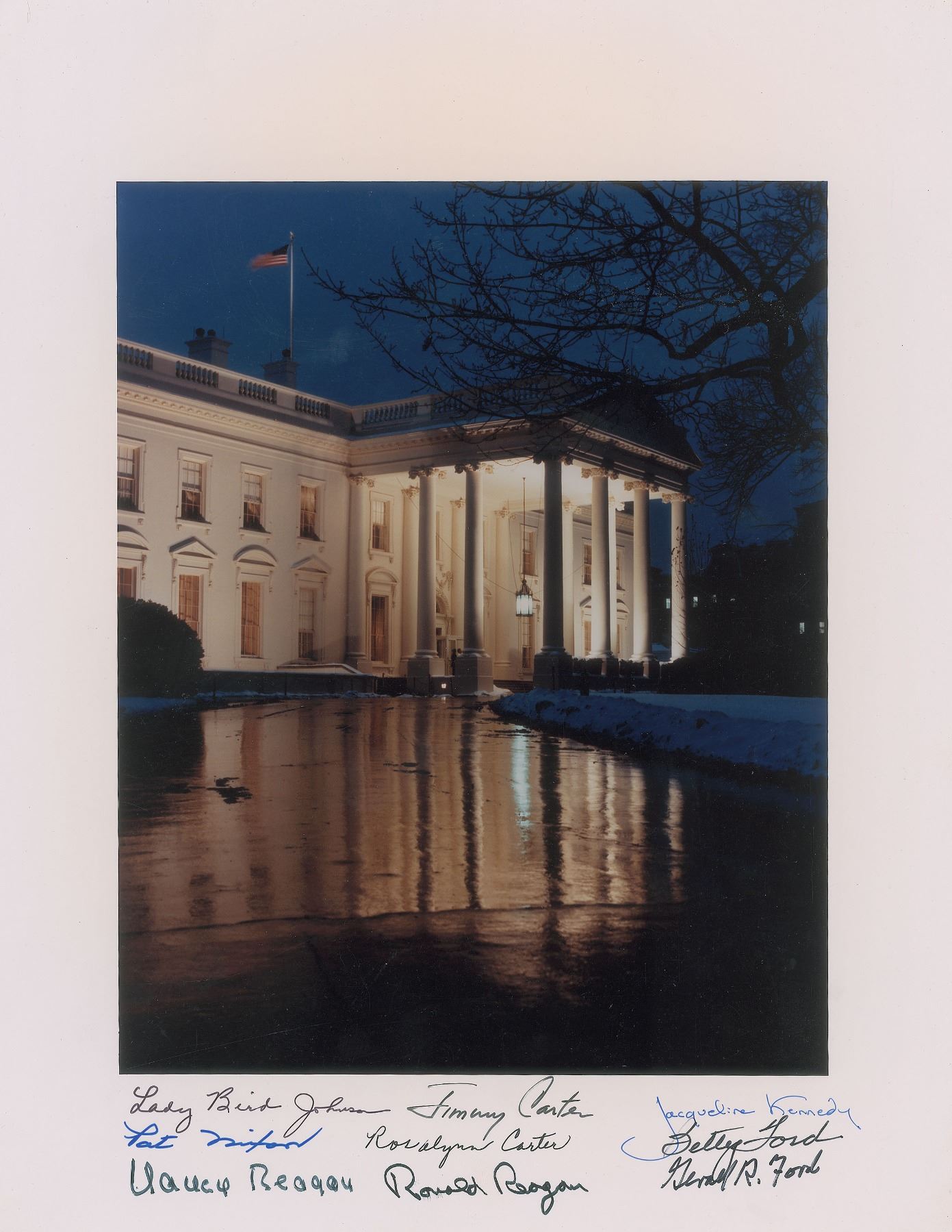Attractive color satin-finish 11 x 14 photo of the illuminated North Portico of the White House on a winter night, signed in the lower border in various colored ink and felt tip by former Presidents Ronald Reagan, Jimmy Carter, and Gerald Ford, and by former First Ladies Jacqueline Kennedy, Nancy Reagan, Lady Bird Johnson, Pat Nixon, Rosalynn Carter, and Betty Ford. In very good condition, with overall creasing, and a very short tear to the left edge.