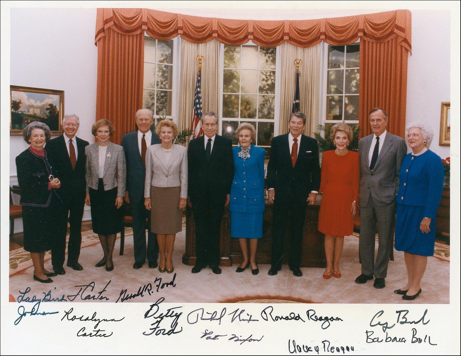 Color satin-finish 10 x 8 photo of Presidents Carter, Ford, Nixon, Reagan, and Bush, as well as their wives and Lady Bird Johnson, all posing together in the Oval Office, signed in black felt tip in the lower border and bottom portion of image by all 11 presidents and first ladies. In fine condition. A very presentable item signed by five consecutive Chief Executives and the women behind them, taken during a visit with President George Bush.