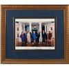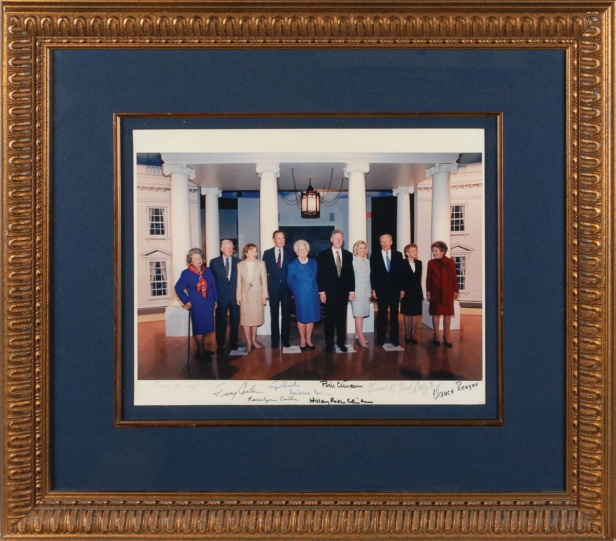 Extremely rare color satin-finish 14 x 11 photo of four presidents and six first ladies in front of a replica White House at the dedication of the George Bush Presidential Library in 1997, signed in the lower border in felt tip by Lady Bird Johnson, Gerald Ford, Betty Ford, Jimmy Carter, Rosalynn Carter, Nancy Reagan, George Bush, Barbara Bush, Bill Clinton, and Hillary Rodham Clinton. Mounted, cloth-matted, and framed to an overall size of 24.5 x 21.5. In fine condition, with some creasing to the borders, and Johnson’s signature faded but still legible. Carter signed over his own signature after the initial one began to fade, which is explained in an accompanying letter from the Carter Center. Photos signed by such a great quantity of the White House’s chief occupants are exceptionally hard to find. Oversized.