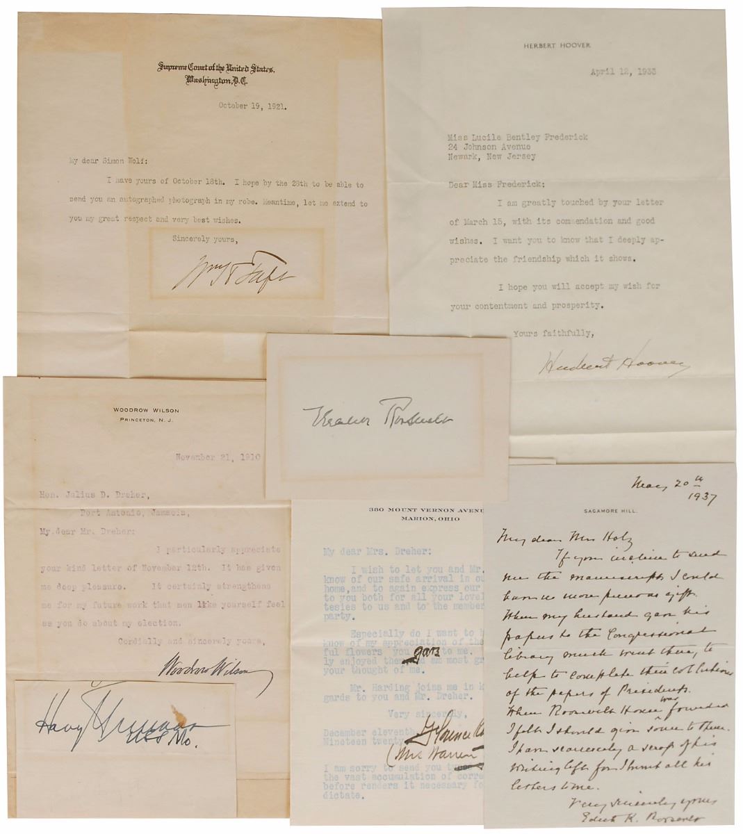 Group of seven items, comprised of letters and signatures, each signed by a former president or first lady, including: William Taft (TLS), Harry S. Truman (signature), Herbert Hoover (TLS), Woodrow Wilson (TLS), Eleanor Roosevelt (signature), Florence Harding (TLS), and Edith Roosevelt (ALS). In overall very good to fine condition. The Harding letter is accompanied by the original mailing envelope.