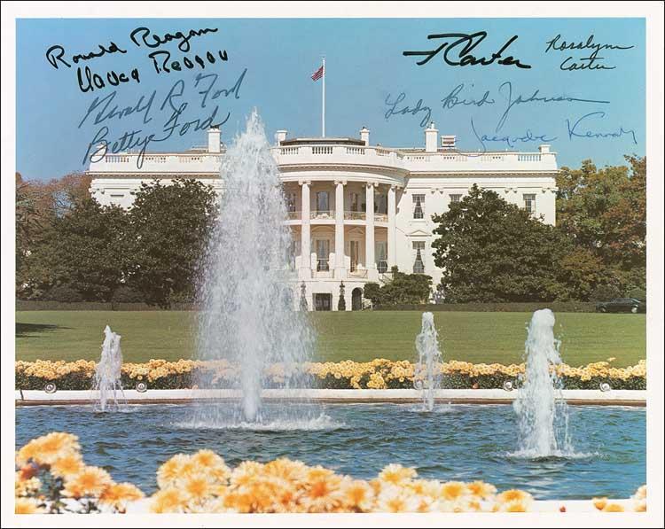Color 10 x 8 photo of the White House, signed in black felt tip and ink by Ronald and Nancy Reagan, Gerald and Betty Ford, J[immy] and Rosalynn Carter, Jacqueline Kennedy, and Lady Bird Johnson. In fine condition, with a couple light brushes to Johnson’s signature. Pre-certified PSA/DNA and RRAuction COA.