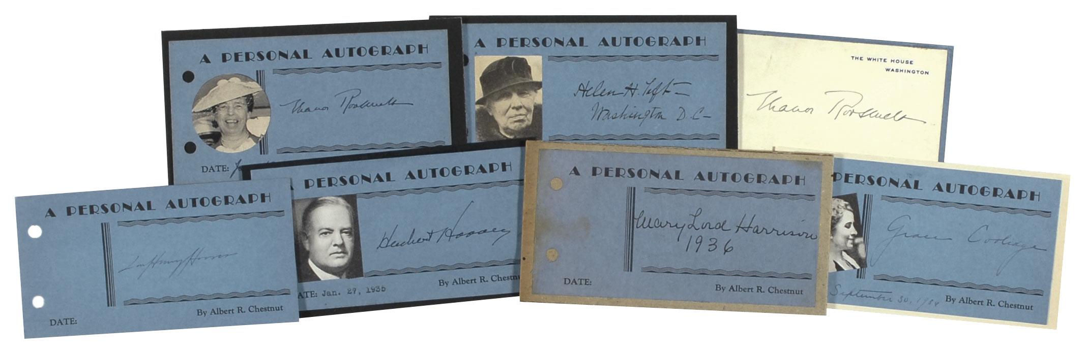 Vintage fountain pen signatures of Herbert Hoover, Lou Henry Hoover, Helen Taft, Grace Coolidge, Mary Lord Harrison, and Eleanor Roosevelt on individual 5.5 x 2.75 blue cards from the Albert R. Chestnut collection; and a White House card signed in fountain pen by Eleanor Roosevelt, affixed to an identical light blue card. Almost all cards are affixed to slightly larger black or gray cards. Photos affixed to a couple of cards, and some scattered light toning to several signatures, otherwise fine condition. RRAuction COA.