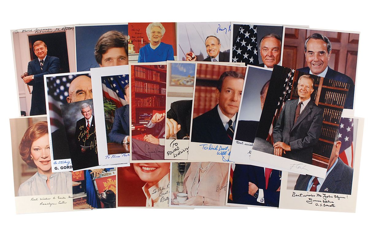 Collection of 20 photos, various sizes and finishes, each signed in ink or felt tip by a different former president, first lady, or politician. Signers are: Jimmy Carter, Rosalynn Carter (ins), Barbara Bush (2 ins), Betty Ford (2, 1 ins), Joe Biden, John Kerry, Rudy Giuliani, Orin Hatch (ins), Strom Thurmond (ins), Cyrus Vance, Newt Gingrich (ins), Dan Rostenkowski, G. Gordon Liddy (ins), Jesse Helms (ins), Bob Dole (ins), Pat Buchanan (ins), Al Simpson (ins), and Alexander Haig (ins). Also included is a TLS signed by Adlai Stevenson. In fine condition.