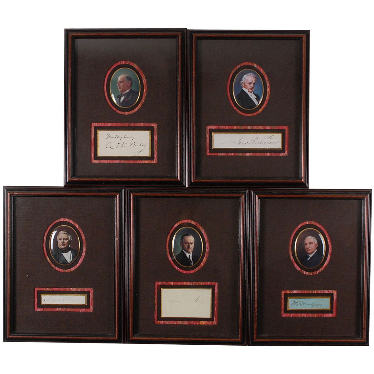 Ink signatures of Warren G. Harding, Calvin Coolidge, Millard Fillmore, James Buchanan (franking signature), and William McKinley on various size clipped slips. Each slip is affixed to a slightly larger mount and individually double-cloth-matted and framed with a color cameo portrait to an overall size of 10.25 x 13.5. In overall fine condition.
