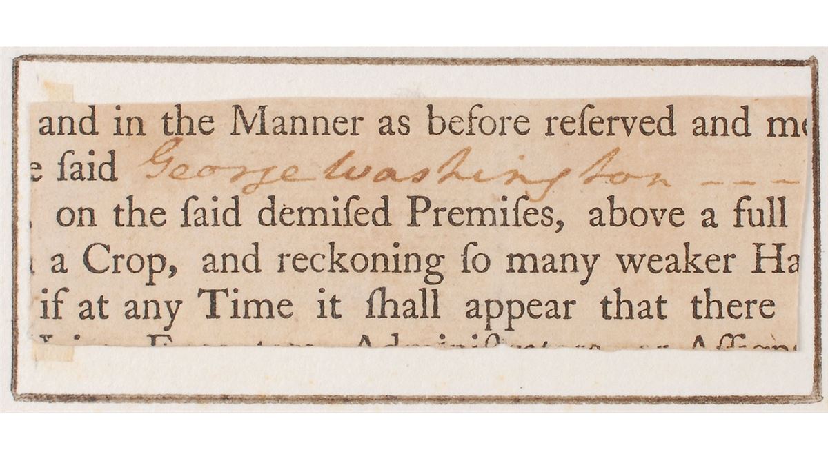 Full ink signature, “George Washington,” on an off-white 3.25 x 1 slip clipped from the body of a larger document.