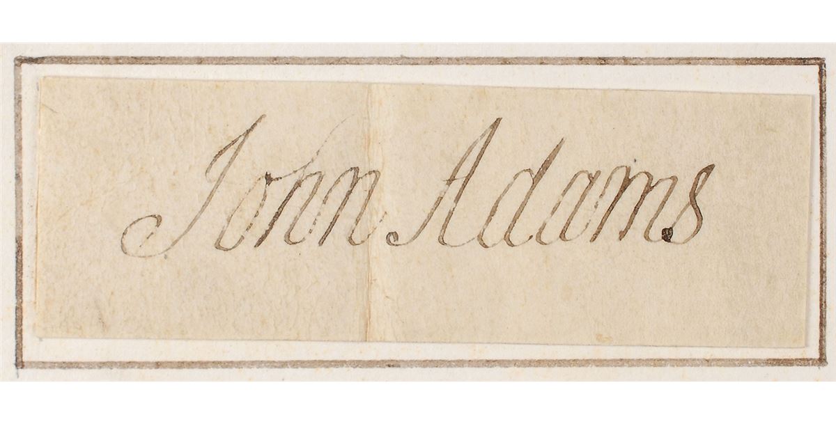 Bold ink signature, “John Adams,” on an off-white 3.25 x 1 slip.