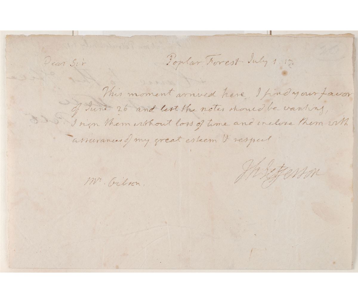 ALS signed “Th: Jefferson,” one page, 7 x 5, July 1, 1817. Letter to Mr. Gibson, written from his Poplar Forest estate. In full: “This moment arrived here. I find your favor of June 26 and lest the notes should be wanting, I sign them without loss of time and enclose them with assurance of my great esteem & respect.”
