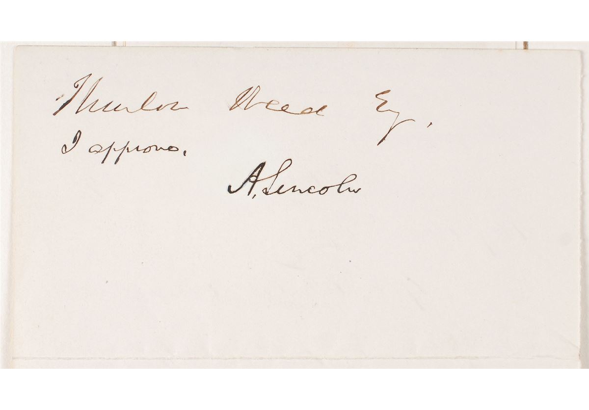 Civil War–dated autograph endorsement signed as president, “I approve, A. Lincoln,” on the reverse of an ALS by Secretary of State William H. Seward, one page, 5 x 8, June 29, [1861]. Seward’s letter, to editor and power broker Thurlow Weed, in full: “You would cause an important public service by visiting Genl Butler at Fortress Monroe, and conferring with him upon the matters arising there and bringing to us from him an explanation of his views as to the expediency of movement and the manner thereof.” Also endorsed on the reverse by General Winfield Scott, “Very good, W. Scott.” Lincoln endorsed this letter on the same day his cabinet overruled Scott’s recommendation to hold off on a major attack until at least the end of summer as the soldiers were not battle ready. Due to calls from Congress and the press for imminent action, Scott’s reservations were ignored—with disastrous consequences the following month at Bull Run.