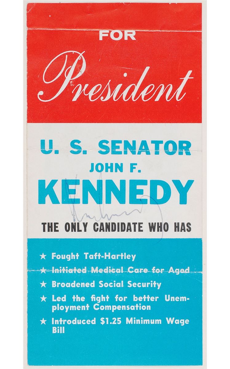 Patriotic red, white, and blue flyer for John F. Kennedy’s 1960 presidential campaign outlining his achievements in Congress, signed in ballpoint.