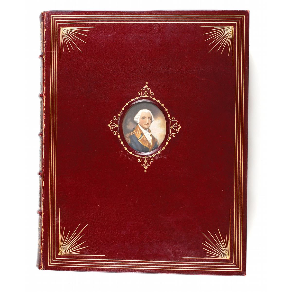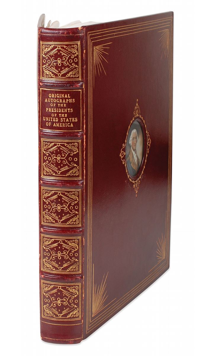 Magnificent complete collection of every American president from George Washington through Barack Obama, consisting of various formats such as clipped signatures, free franks, documents, and letters, each tipped to an album page in chronological order inside a gorgeous 13.5 x 16.5 leatherbound presentation volume. Engraved portraits and images of the presidents are also affixed throughout. Signers and formats include: George Washington (signature), John Adams (signature), Thomas Jefferson (ALS), James Madison (signature), James Monroe (signature), John Quincy Adams (free frank), Andrew Jackson (signature), Martin Van Buren (free frank), William H. Harrison (DS), John Tyler (signature), James K. Polk (free frank), Zachary Taylor (free frank signature), Millard Fillmore (signature), Franklin Pierce (signature), James Buchanan (signature), Abraham Lincoln (endorsement), Andrew Johnson (signature), Ulysses S. Grant (signature), Rutherford B. Hayes (signature), James A. Garfield (signature), Chester A. Arthur (signature), Grover Cleveland (signature), Benjamin Harrison (check), William McKinley (signature), Theodore Roosevelt (signature), William H. Taft (signature), Woodrow Wilson (White House card), Warren G. Harding (printed speech), Calvin Coolidge (White House card), Herbert Hoover (TLS), Franklin D. Roosevelt (signature), Harry S. Truman (signature), Dwight D. Eisenhower (TLS), John F. Kennedy (campaign ad), Lyndon B. Johnson (bookplate), Richard M. Nixon (TLS), Gerald R. Ford (TLS), Jimmy Carter (TLS), Ronald Reagan (inauguration pass), George Bush (TLS), Bill Clinton (TLS), George W. Bush (bookplate), and Barack Obama (title page). In overall very good to fine condition. A thoughtfully assembled and well-presented set of tremendous appeal.