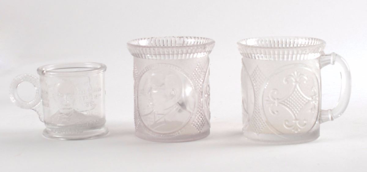 Three glass mustard jars with handles: a memorial glass honoring the nation’s fallen presidents, measuring 2.5? in diameter and 2.5? tall, depicting assassinated presidents Abraham Lincoln and James A. Garfield, along with their birth and death dates and “Our Country’s Martyrs” in raised text on the bottom; and two glasses of identical design depicting the candidates of the 1896 presidential campaign, measuring 3.25? in diameter and 3.5? tall, one showing Republican William McKinley with the slogan “Protection and Prosperity,” and the other showing his opponent Democrat William Jennings Bryan with the slogan “The Peoples Money.” A chip to the rim of the assassination memorial jar, otherwise overall fine condition.