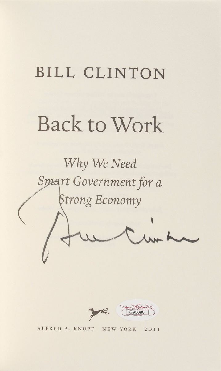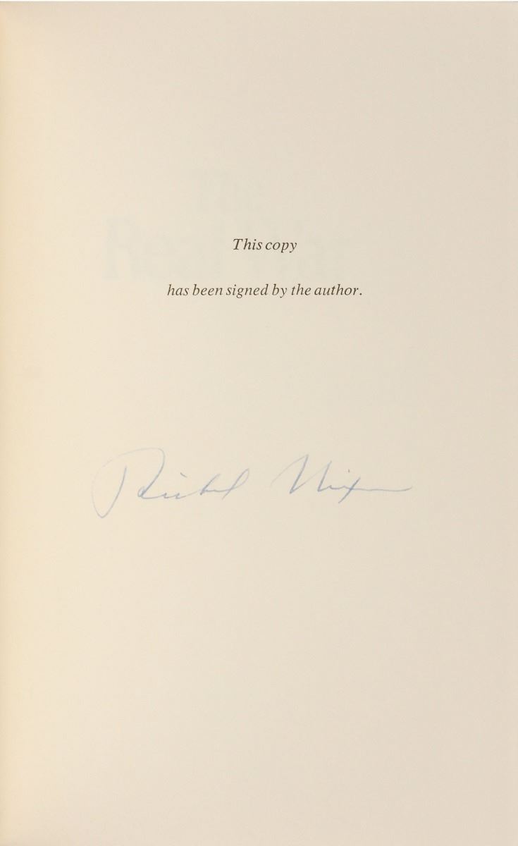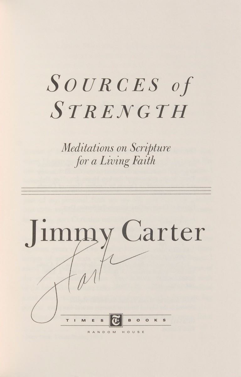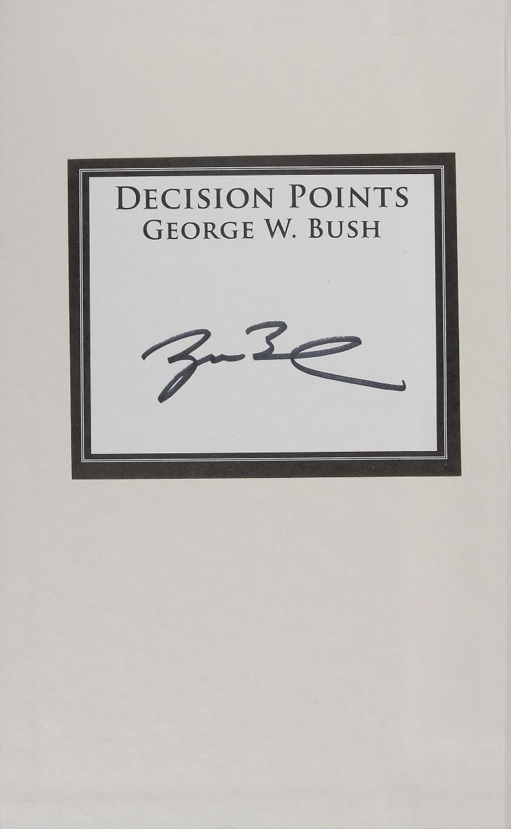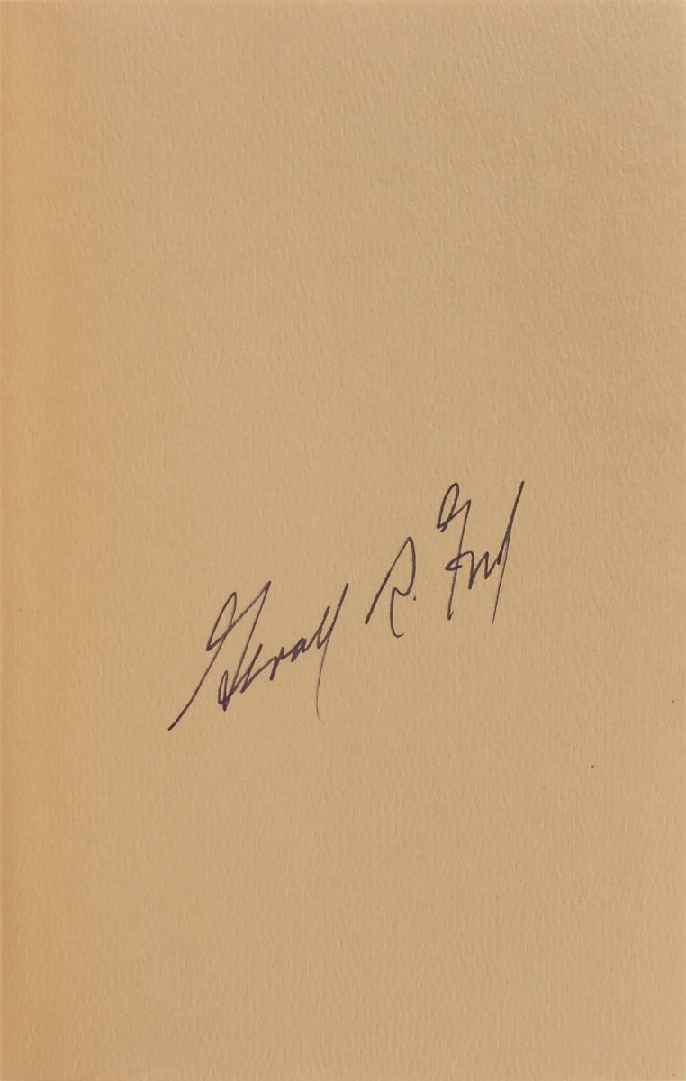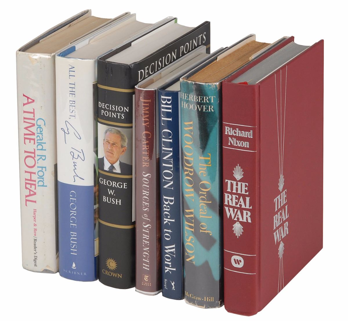 Collection of seven hardcover books, each signed by a president, including: Herbert Hoover (ins; The Ordeal of Woodrow Wilson), Gerald Ford (A Time to Heal), Richard Nixon (The Real War), George W. Bush (bookplate affixed to front pastedown; Decision Points), George Bush (bookplate affixed to front pastedown; All the Best, George Bush), Bill Clinton (Back to Work), and Jimmy Carter (Sources of Strength). In overall fine condition. The Clinton book is accompanied by a certificate of authenticity from JSA.