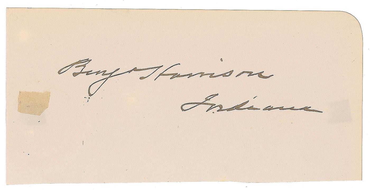 Large and bold ink signature, "Benj. Harrison, Indiana,” on an off-white 6.5 x 3 slip. In fine condition, with a small tape stain that could easily be matted out. Accompanied by an engraved portrait bearing a facsimile signature.