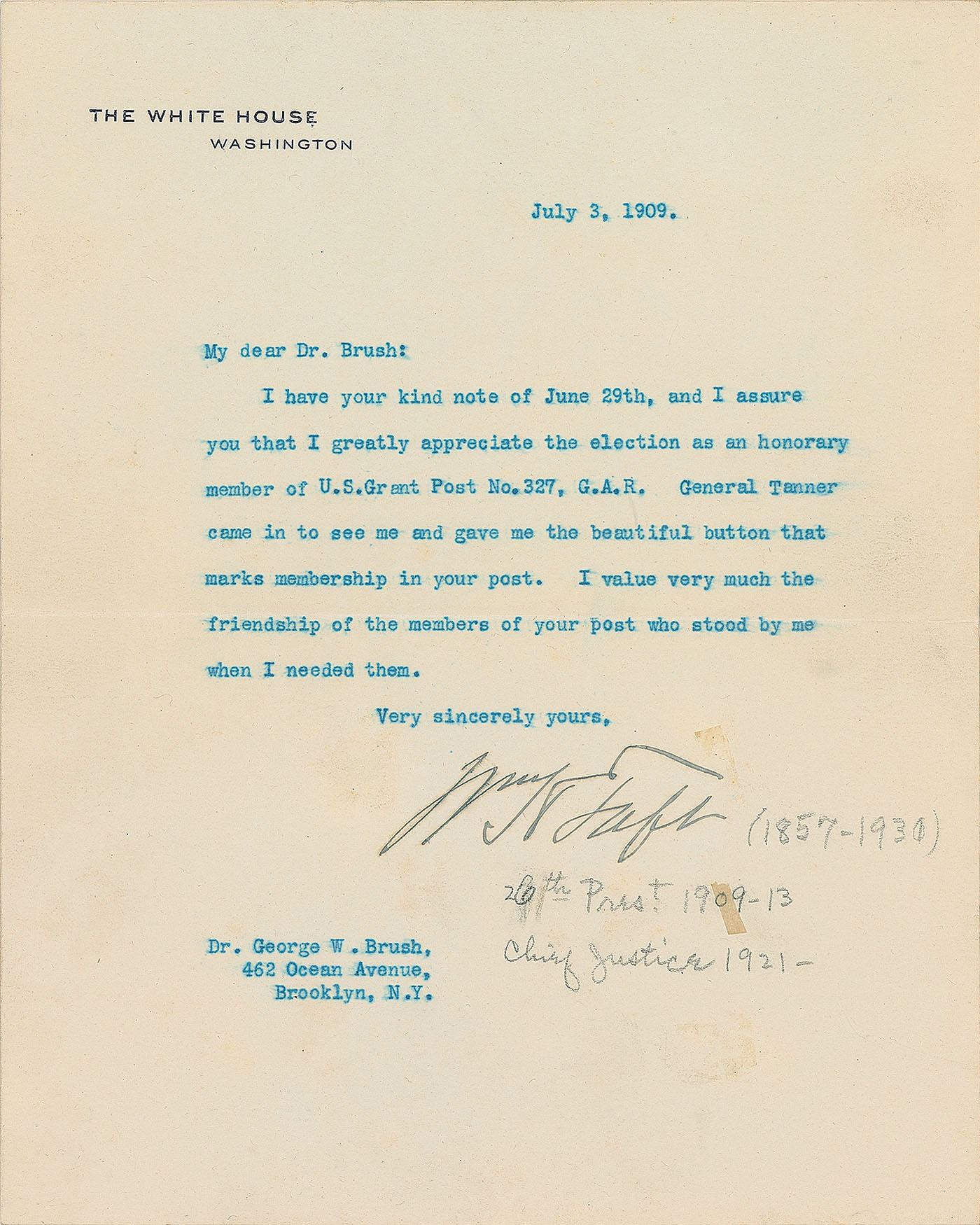 TLS as president signed “Wm. H. Taft,” one page, 7 x 8.75, White House letterhead, July 3, 1909. Letter to Dr. George W. Brush in Brooklyn, in part: "I greatly appreciate the election as an honorary member of U.S. Grant Post No. 327, G.A.R. General Tanner came in to see me and gave me the beautiful button that marks membership in your post. I value very much the friendship of the members of your post who stood by me when I needed them." In fine condition, with three small old tape stains in the signature area. Accompanied by an unsigned engraved portrait.
