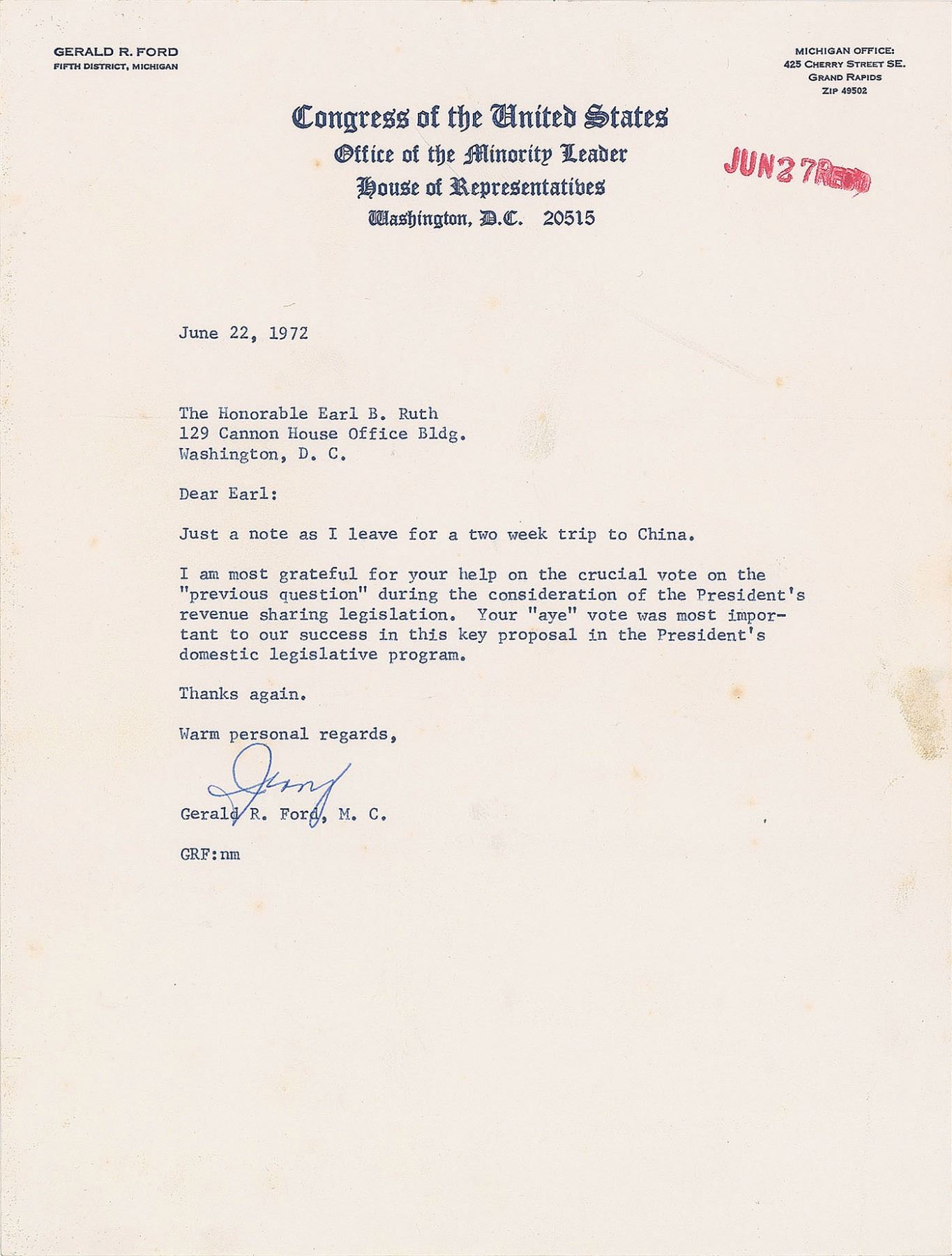 TLS signed “Jerry,” one page, 8 x 10.5, Congress of the United States, Office of the Minority Leader, House of Representatives letterhead, June 22, 1972. Letter to the Hon. Earl B. Ruth, a Republican congressman from North Carolina, in part: "Just a note as I leave for a two week trip to China. I am most grateful for your help on the crucial vote on the 'previous question' during the consideration of the President's revenue sharing legislation. Your 'aye' vote was most important to our success in this key proposal in the President's domestic legislative program." In fine condition, with a few light stains. Building upon President Nixon’s famous trip to the People’s Republic of China in February, Gerald R. Ford and Congressman Hale Boggs of Louisiana visited and met with Premier Chou En-lai from June 23–July 7, 1972.