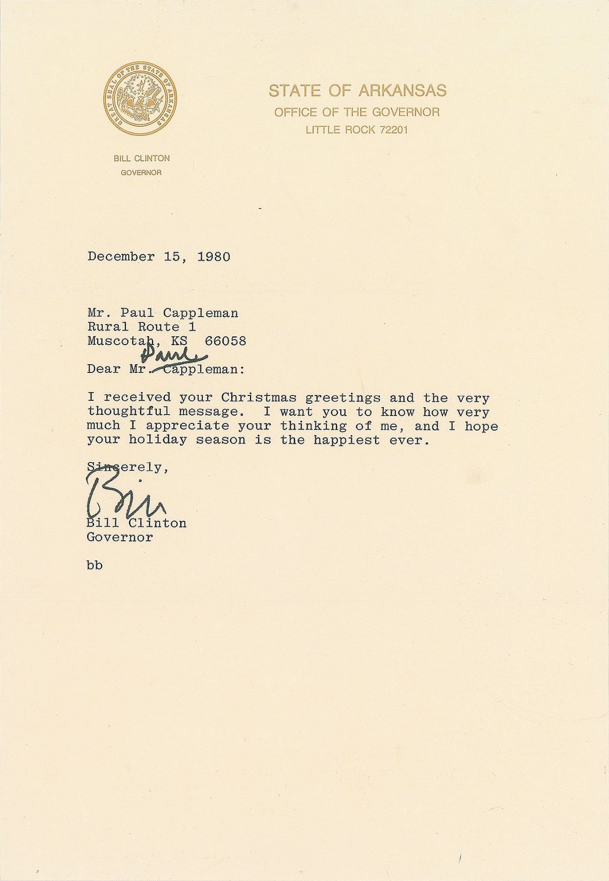 TLS signed “Bill,” one page, 7.25 x 10.5, State of Arkansas letterhead, December 15, 1980. Letter to Paul Cappleman in Kansas, in full: "I received your Christmas greetings and the very thoughtful message. I want you to know how very much I appreciate your thinking of me, and I hope your holiday season is the happiest ever." Clinton handwrites "Paul" in the opening salutation. In fine condition.