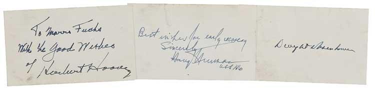 Ink signatures of Herbert Hoover, Harry S. Truman, and Dwight D. Eisenhower on individual off-white 4 x 2.5 cards. Hoover adds a brief inscription, and Truman adds a short sentiment. Scattered soiling to all three, and a paperclip impression to top of Truman’s card, otherwise fine condition. Pre-certified John Reznikoff/PSA/DNA and RRAuction COA.