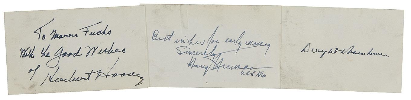 Ink signatures of Herbert Hoover, Harry S. Truman, and Dwight D. Eisenhower on individual off-white 4 x 2.5 cards. Hoover adds a brief inscription, and Truman adds a short sentiment. In fine condition, with a paperclip impression to top of Truman’s card. Pre-certified John Reznikoff/PSA/DNA and RRAuction COA.