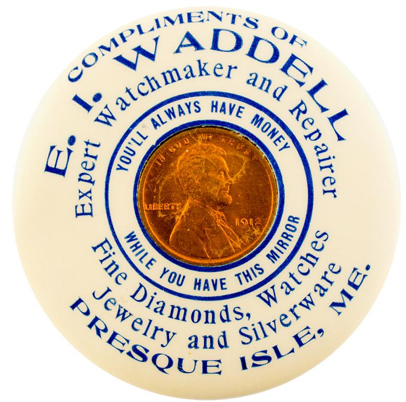 Compliments of E. I. Waddell. Expert watchmaker and repairer. Fine diamonds, watches, jewelry and silverware. Encircled brilliant uncirculated 1912 Lincoln penny. "You'll always have money while you have this mirror".