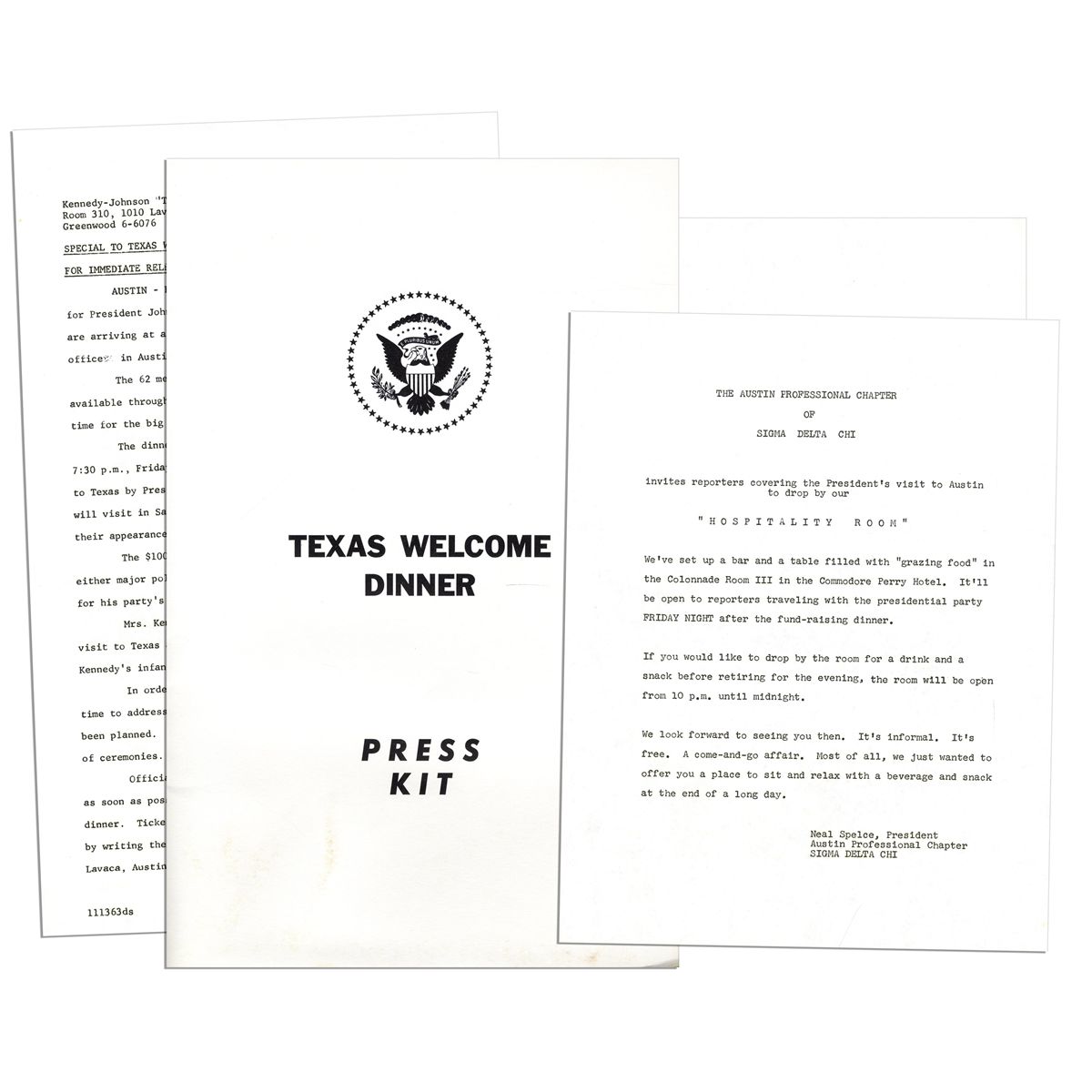 Press kit for the JFK Welcome Dinner slated for the evening of 22 November 1963 in Austin, Texas. Each 1-2pp. typed press release in the kit supplies the media with news pertaining to Kenendy's visit and promotes the sale of tickets to the dinner. One release serves as a who's-who of the guest list, and others cover such specifics as the menu and dress code. The President's motorcade line-up is furnished as well. A total of 16 original sheets are housed within a white pocket folder printed starkly in black, ''Texas Welcome Dinner / Press Kit'', with an E. Pluribus Unum seal printed at the top. In addition, the lot includes a 1pp. typed memorandum providing White House Pressman Wayne Hawks' Texas itinerary. The press releases all measure either 8.5'' x 11'' or 8.5'' x 14''. All releases are in near fine to fine condition. Folder measures 9'' x 14''. Scattered bits of light toning or staining, with rust to staples on the pockets and creasing to left pocket, else near fine. Memo measures 8.5'' x 11''. Near fine.