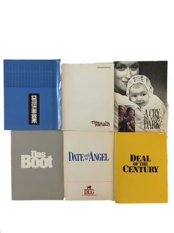 Collection of 6 press kits with black and white publicity stills included, from various movie studios, sized mainly 8x10's. (1980's). From United Artists "Cutter and Bone" (1980), from United Artists "Curse of the Pink Panter" (1983), from Cannon Films "A Cry In the Dark" (1988), from Columbia Pictures 'Das Boot"(1982), from DEG Entertainment "Date With an Angel" (1987), from Warner Brothers "Deal of The Century" (1983).