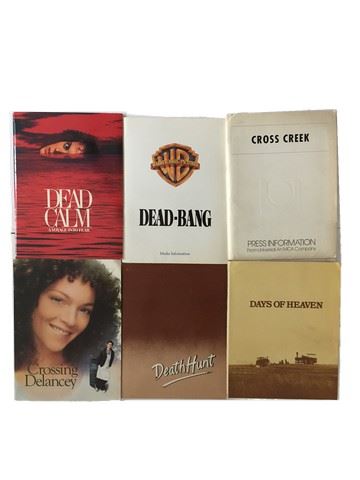 Collection of 6 press kits with black and white publicity stills included, from various movie studios, sized mainly 8x10's. (1970's-80's). From Warner Brothers "Dead Calm" (1989), from Warner Brothers "Crossing Delancy" 91988), from Universal "Cross Creek" (1983), from Warner Brothers "Dead Bang" (1989), from Paramount "Days of Heaven" (1978), from 20th Century Fox "Death Hunt" (1981).