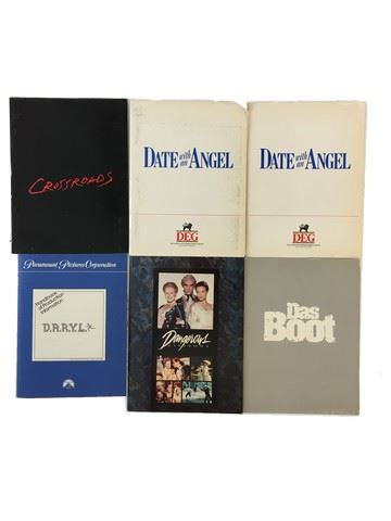 Collection of 5 press kits with black and white publicity stills included, from various movie studios, sized mainly 8x10's. (1980's). From Columbia Picures "Crossroads"(1989), from DEG Entertainment Group "Date with An Angel"(1987), From Paramount Pictures "D.A.R.Y.L. (1985), from warner Brothers "Dangerous Liasons" (1988), from Columbia Pictures "Das Boot" (1982).