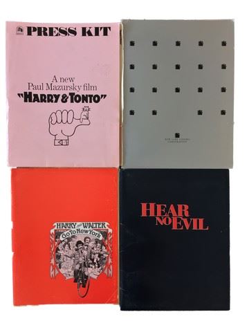 Collection of 4 press kits with black and white publicity stills included, sized mainly 8x10's, from various movie studios. (1970's-90's) From New Line Cinema "The Hidden" (1987) starring Kyle MacLachlan as Agent Lloyd, Michael Nouri as Det.Thomas Beck, and Richard Brooks as Det. Sanchez, includes 9 stills. From 20th Century Fox "Harry & Tonto" (1974) starring Art Carney as Harry Coombes, Tonto as Tonto, and Herbert Berghof as Jacob, includes 1 still. From Columbia Pictures "Harry and Walter Go to New York" (1976) starring James Caan as Harry Dighby, Elliot Gould as Walter Hill, and Michael Caine as Adam Worth, includes 9 stills. From 20th Century Fox "Hear No Evil" (1993) starring Marlee Matlin as Jillian Shanahan, John C McGinley as Mickey O'Malley, and D.B. Sweeney as Ben Kendall, includes 4 stills.