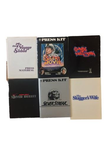 Collection of 5 press kits with black and white publicity stills included, sized mainly 8x10's from various movie studios. (1950's-80's). From 20th Century Fox "Silent Movie"(1976) starring Burt Reynolds as himself, James Caan as Himself, and Liza Minnellii as Herself, includes 7 stills. From Columbia Pictures "The 7th Voyage of Sinbad" (1958) starring Kerwin Mathews as Sinbad, Katherine Grant as Princess Parisa, and Richard Eyer as Barani or The Genie, includes 6 stills. From 20th Century Fox "Silver Streak"(1976) starring Gene Wilder as George Caldwell, Jill Clayburgh as Hilly, and Richard Pryor Grover, includes 4 stills. From Tri Star Pictures "Slaves of New York" only publicity stills no press kit (1989) starring Bernadette Peters as Eleanor, Chris Sarandon Victor Okrent, includes 14 stills. From Paramount Pictures "Silver Bullet" (1985) starring Gary Busey as Uncle Red, Everett McGill as Werewolf, and Corey Haim as Marty Coslaw, includes 8 stills. From Columbia Pictures "The Sluggers Wife" (1985) starring Michael O'Keefe as Darryl, Rebecca De Mornay as Debbie, and Randy Quaid as Moose, includes 3 stills.
