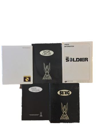 Collection of 5 press kits with black and white publicity stills included, sized mainly 8x10's from various movie studios. (1980's). From Tri Star Pictures "Short Circuit" (1986) starring Steve Guttenberg as Newton Crosby, Ally Sheedy as Stephanie Speck, and Fisher Stevens Ben Jabituya, includes 10 stills. From Tri Star "Slaves of New York" (1989) starring Bernadette Peters as Eleanor, Chris Sarandon as Victor Okrent, and Mary Beth Hurt as Ginger Booth, no stills included. From MGM "Shoot The Moon" (1982) starring Diane Keaton as Faith, Albert Finney as George, and Karen Allen as Sandy, includes 12 stills. From Embassy Pictures "The Soldier"(1982) starring Ken Wahl as The Soldier, Alberta Watson as Susan Goodman, and William Prince as the President, includes 11 stills. From Tri Star Pictures "Sing"(1989) starring Peter Dobson as Dominic, Patti LaBelle as Mrs.DeVere, and Jessica Steen as Hannah, includes 15 stills.