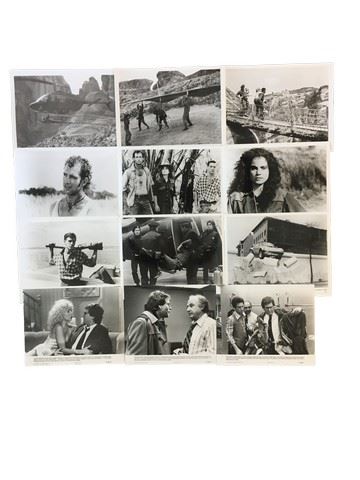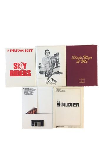 Collection of 5 press kits with one digital kit with black and white publicity stills included, sized mainly 8x10's from various movie studios. (1970's-90's). From Universal Studios "Sneakers" (1992) starring River Phoenix as Carl, Robert Redford as Martin, and Mary McDonnell as Liz, includes 1 disk and 5 stills. From 20th Century Fox "Sky Riders" (1976) starring Robert Culp as Jonas Bracken, Susannah York as Ellen Bracken, and James Coburn as Jim McCabe, includes 8 stills. From Nelson Entertainment "Slate, Wyn & Me"(1987) starring Martin sacks as Slate Jackson, Sigrid Thornton as Blanche Thornton, and Simon Burke as Wyn Jackson, includes 4 stills and 1 large color poster. From Warner Brother's "So Fine"(1981) starring Ryan O'Neal as Bobby Fine, Richard Kiel as Eddie, and Jack Warden as Jack, includes 14 stills. From Embassy Pictures "The Soldier" (1982) starring Ken Wahl as Zolnierz, Alberta Watson as Susan Goodman, and Joaquim de Almeida as The Soldier, includes 10 stills.