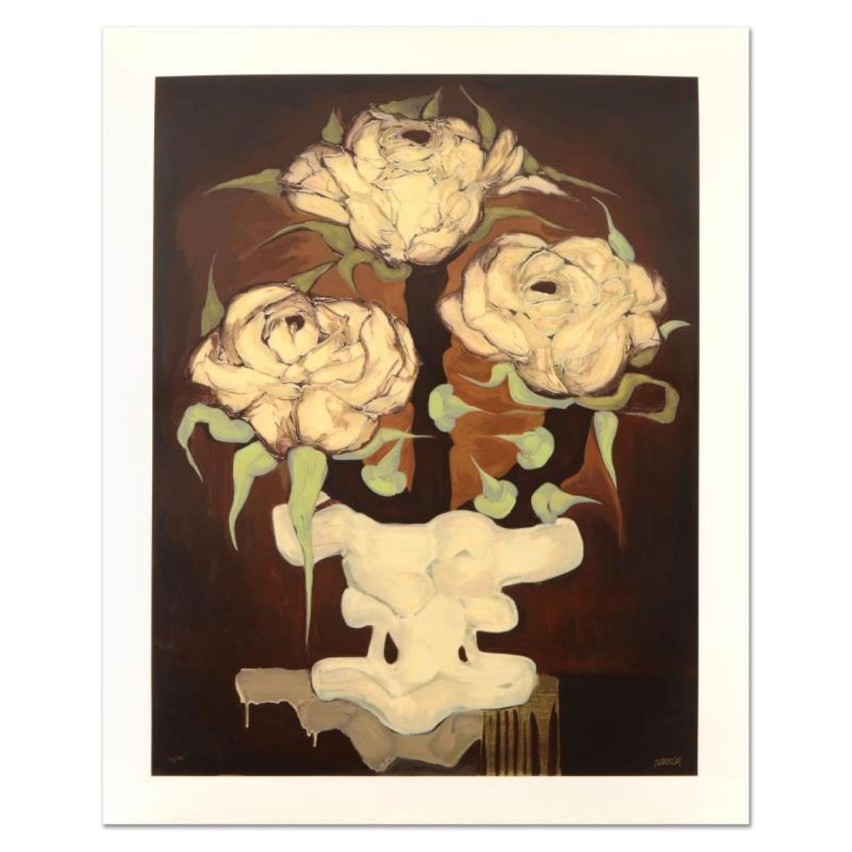 "Press Roses" is a limited edition serigraph on paper by Brenda Barnum, numbered and hand signed by the artist. Includes Certificate of Authenticity. Measures approx. 36" x 46" (border), 30" x 40" (image).