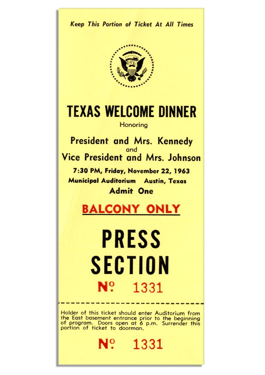 Ticket to the JFK Welcome Dinner slated for the evening of 22 November 1963 in Austin, Texas. Ticket bears all pertinent information about the event that never was: titles, insignia, date, time and address. Serial number 1331 is printed upon the ticket, along with ''Press Section / Balcony Only''. Measures 2.5'' x 6''. Near fine.
