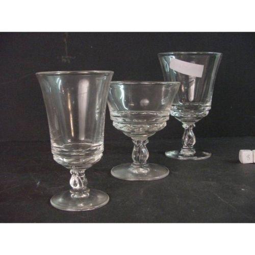 Set of 6 each, Iced Teas, Waters, Juice & Sherbets, triple molded seam trumpet flared body, applied stem and base, there is a scroll design around the bottom of the body of the goblets, other than that, this is an elegantly plain set that would go with any china you could ever put this with. The condition is excellent with no visible chips or cracks, but with 24 pieces, there is probably a small nick somewhere.
