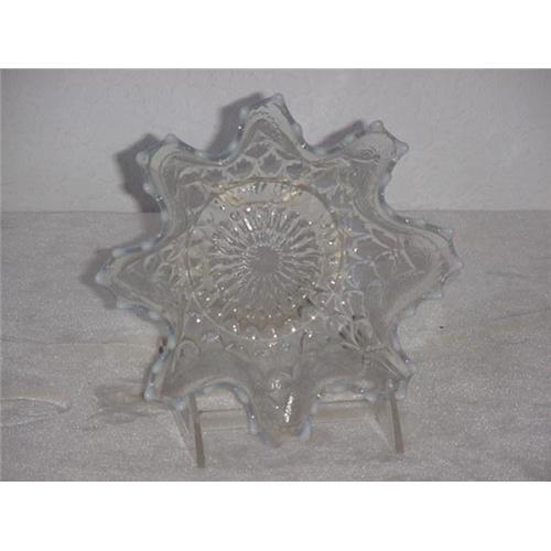 A small pressed glass bowl, 3" tall, 6 3/4" in diameter. Clear glass that is tipped with opalescent points. Condition is very good, no chips.