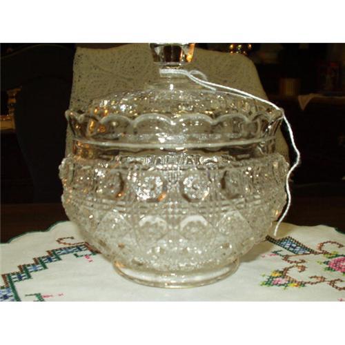 Very nice intricate pattern on this pressed glass candy jar. Available for a very reasonable bid!</em></td>