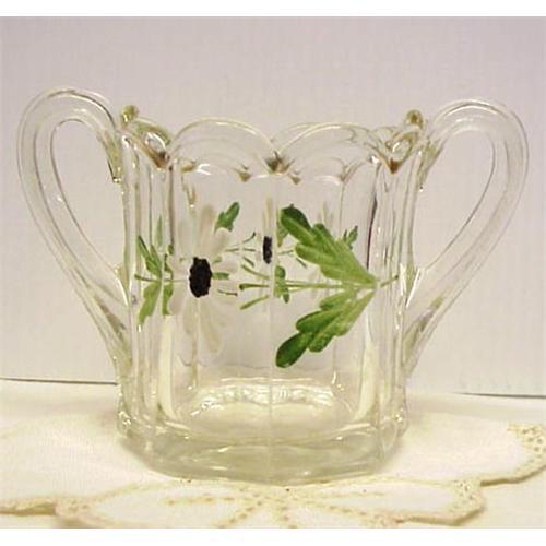 This is old heavy pressed glass two handle SPOONER, Love the hand painted white daisies, Very good condition, free of chips or cracks but for the gold border at the top they are almost gone, It could be easily repainted, This lovely spooner stands 4 1/4" high and 3 1/4 in diam, and from handle to handle 5 3/4" - US Buyer to pay 6.00 for shipping plus insurance if desired - We accept Paypal, Visa, Master Card or Money Order - Thank You very much for looking!