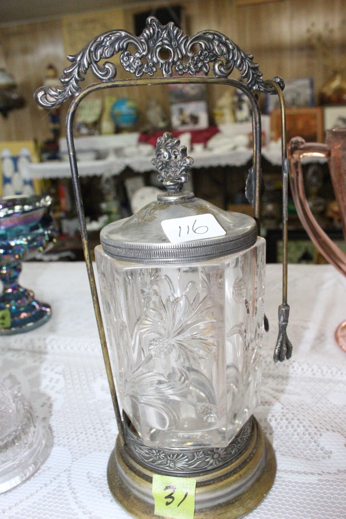 Pressed Glass Pickle Castor an a Ornate Metal Holder with Fork