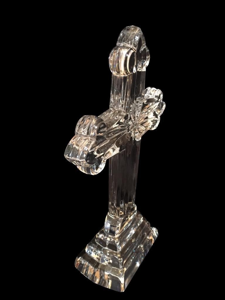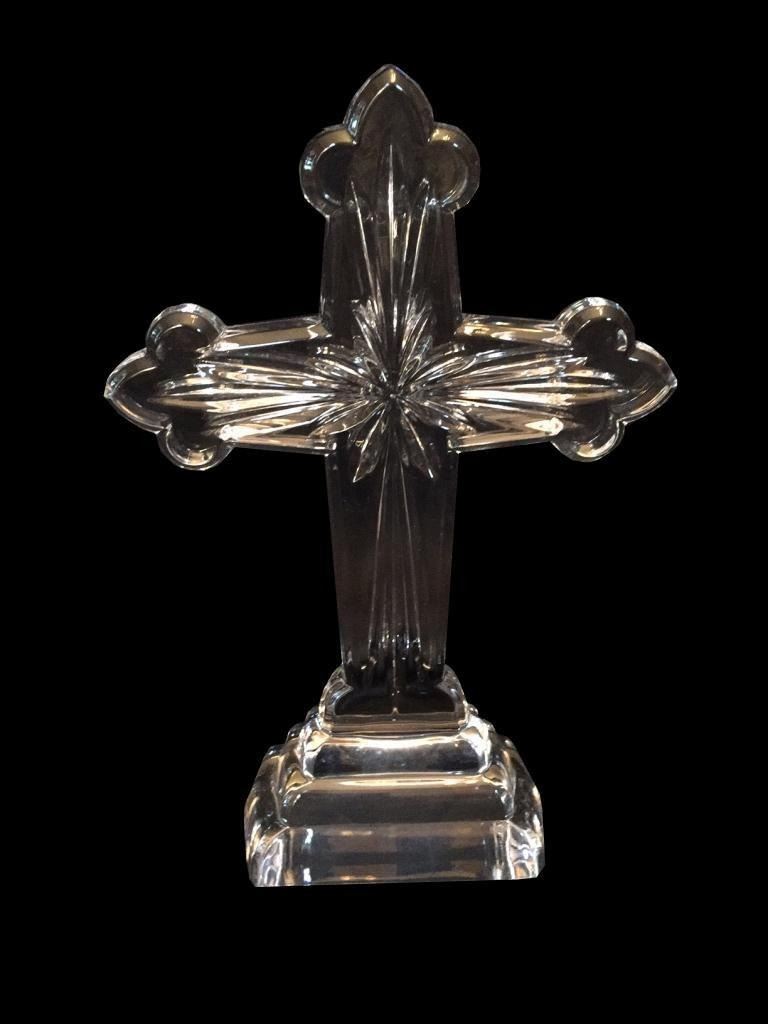 Pressed glass crucifix, standing alter cross. 10" H X 6 3/4" W. Excellant condition.