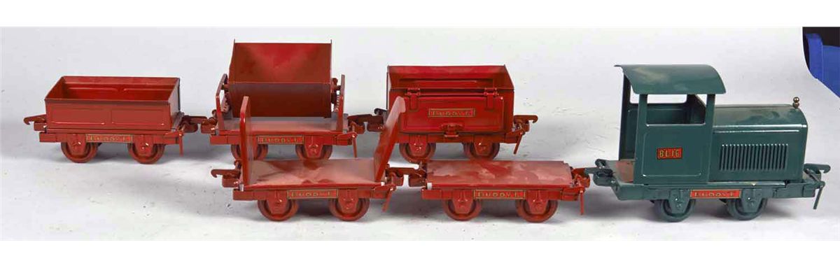 Includes green BL-16 engine, red gondola, rock, ballast, stake, and rocker dump cars. Condition (Restored). Size 47" x 3" x 6"