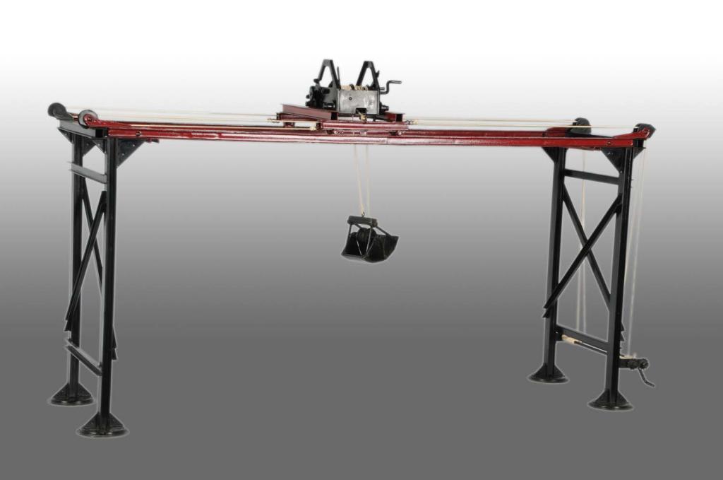 Working. Original bucket with early circular Buddy L decals. Moderate overall crazing and wear to paint. Toy has been restrung. Condition (Very Good). Size 43" x 21".