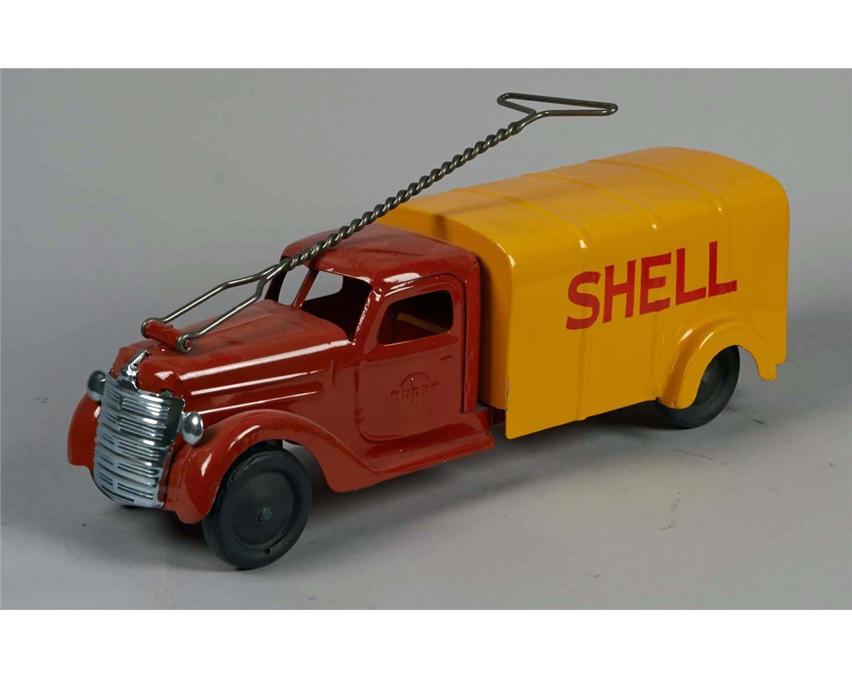 Restored with red tractor, yellow trailer and metal steering handle. Condition (Restored). Size 20" L.