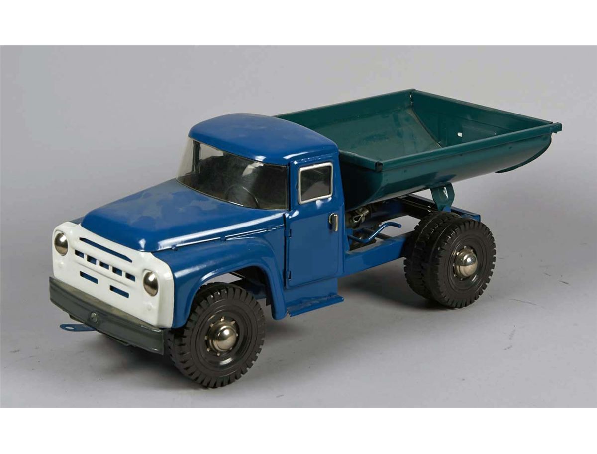Has plastic windows, hydraulic dump mechanism, blue tractor and teal dump bed. Rear plate reads "19-94 A3^K". Condition (Very good). Size 21" x 7-1/2" x 8"