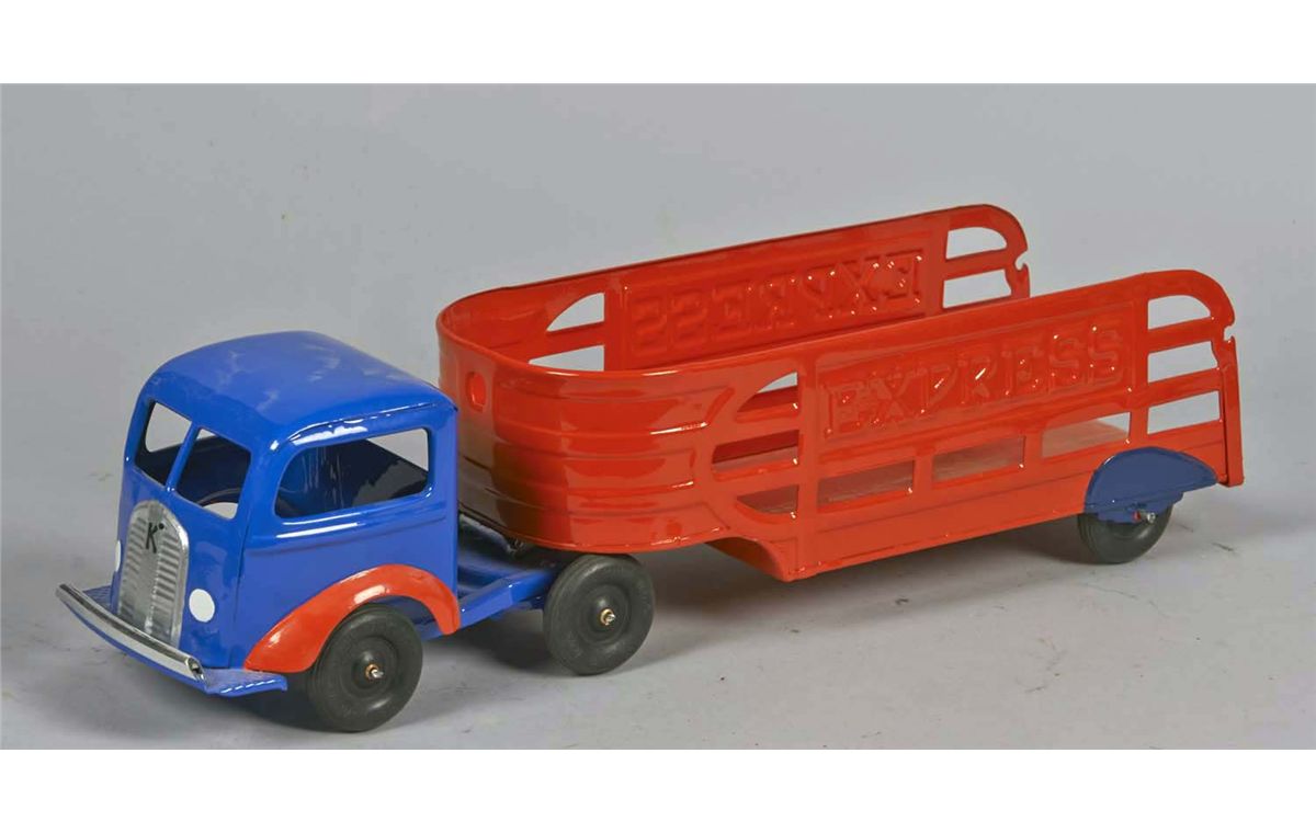 Blue and orange tractor with "Express" embossed on the sides of orange trailer . Has 6 Keystone wheels. Condition (Restored). Size 19" x 5" x 5"