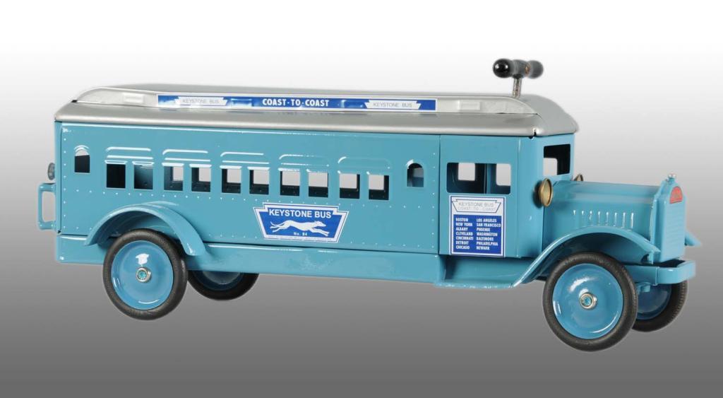 Circa 1930. Packard front cab and passenger bus body with hinged roof. Includes wooden steering handle through roof. Complete restoration to an all original toy. Condition (Restored). Size 32" L.