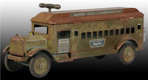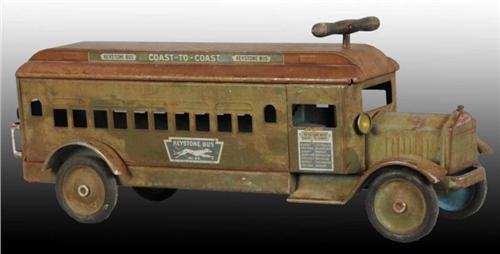 Description American. Circa 1930. Packard front cab and passenger bus body with hinged roof. Complete decals but toy needs total repaint. Condition (Good). Size 32" L.