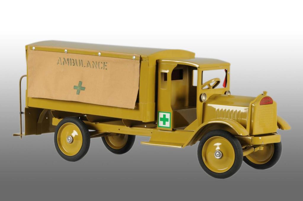 Circa 1928. Packard enclosed cab with rear service body and canvas curtains. Includes reproduction flag. Professional restoration to an all original toy. Condition (Restored). Size 27" L.