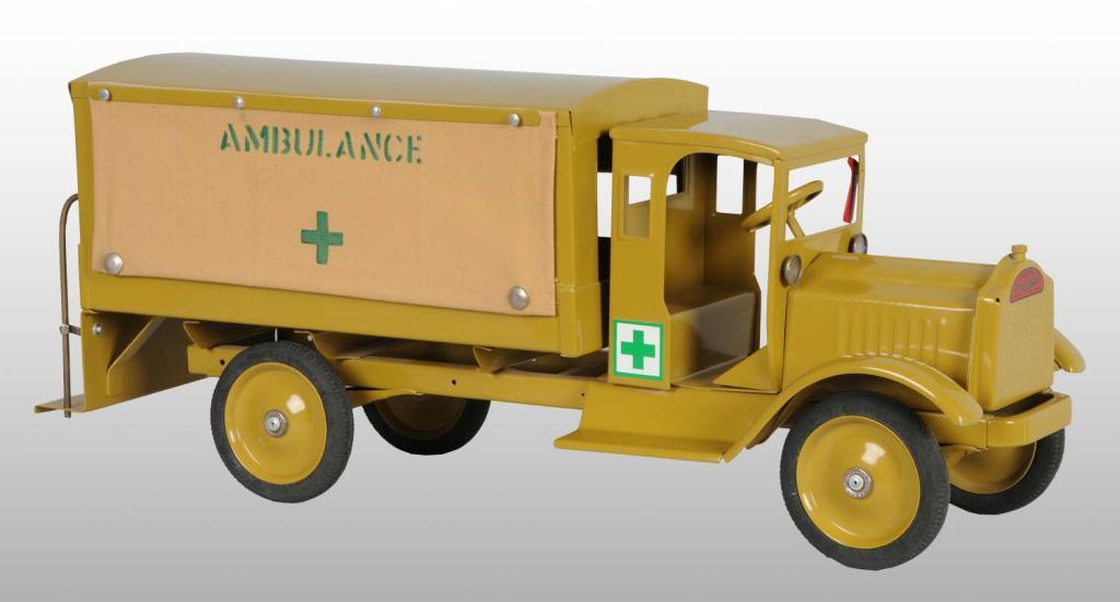 Description Circa 1928. Packard enclosed cab with rear service body and canvas curtains. Includes a reproduction flag. Professional restoration to an all original toy. Condition (Restored). Size 27" L.
